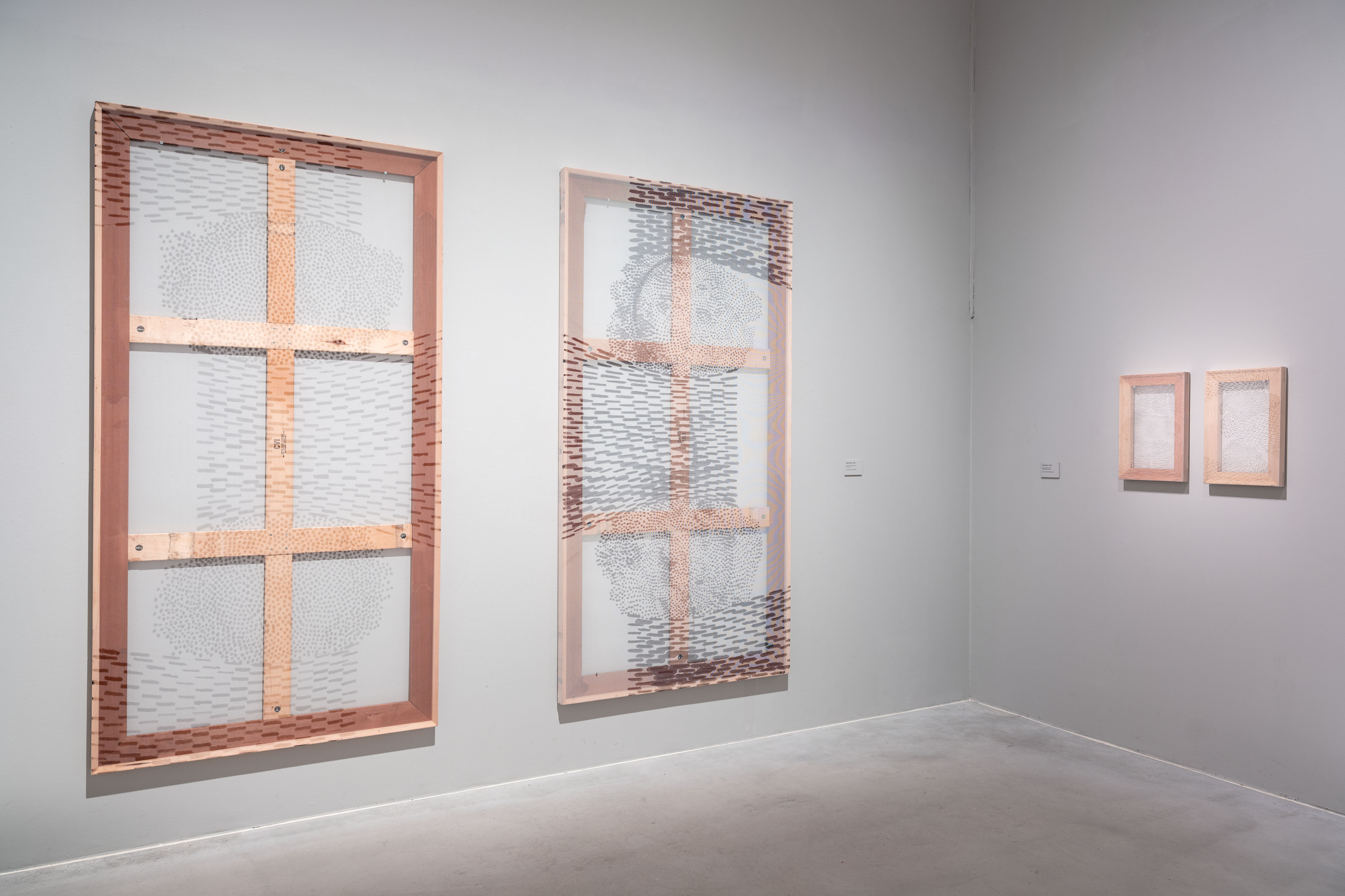 Iron gall ink on synthetic fabric, wooden stretcher